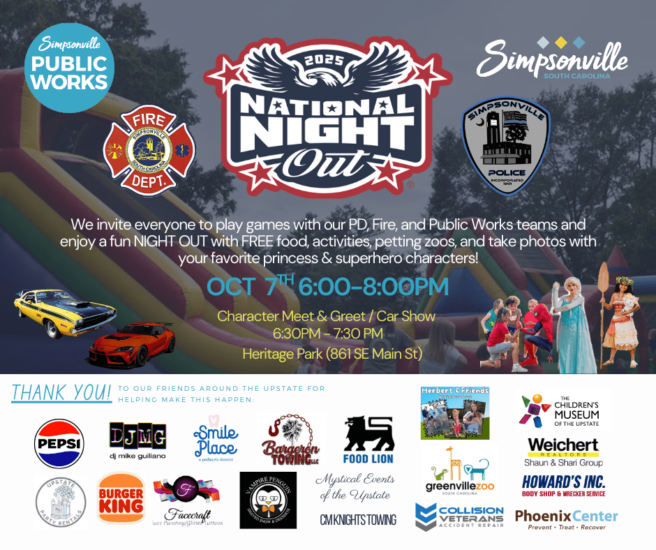 We welcome everyone to our Annual Simpsonville National Night Out event and Car Show! It is free and open to the whole community. We’ll have FREE food and beverages, a car show, face painting, bouncy houses, Touch-A-Truck, character meet & greets, and more! Come take pictures with our first responder vehicles, military humvees, and Pinky the police car. The Greenville Zoo, Warrior’s Table Buggys, The Children’s Museum, and Herbert’s Petting Zoo will provide hands on activities for all ages.