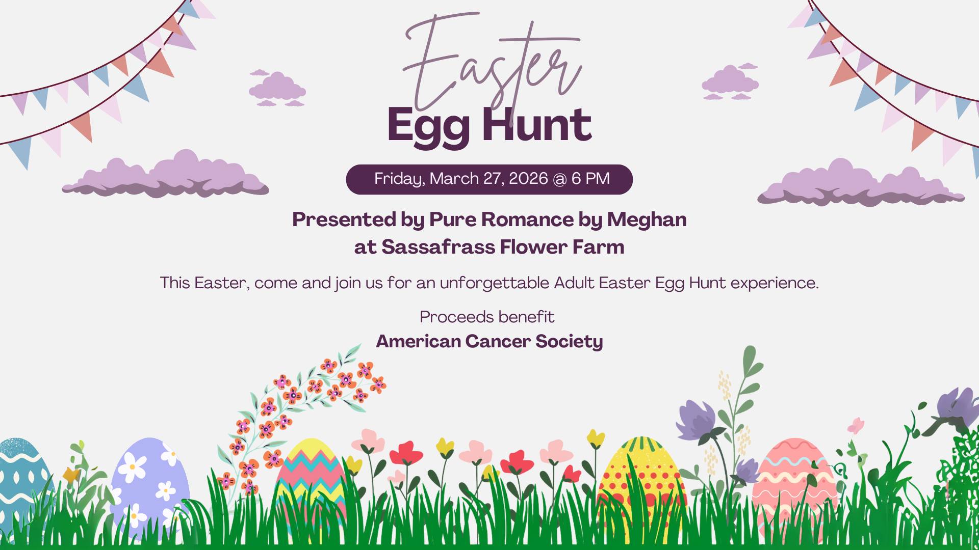 Join this Adult egg hunt benefiting American Cancer Society on the flower farm in Easley! This event for ages 21+. For more details and tickets click here.