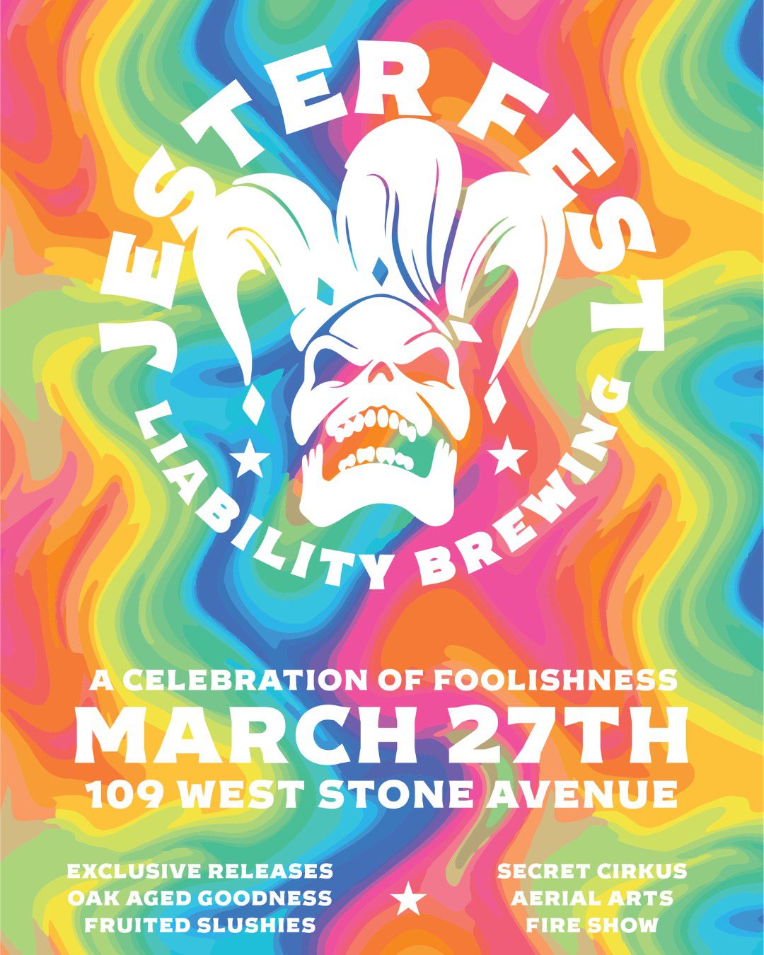Join the brewery for their annual Jester Fest! Featuring special beer releases, frozen drinks, curated flights, aerial act starting around 6:15pm, a fire show at 8pm and more.