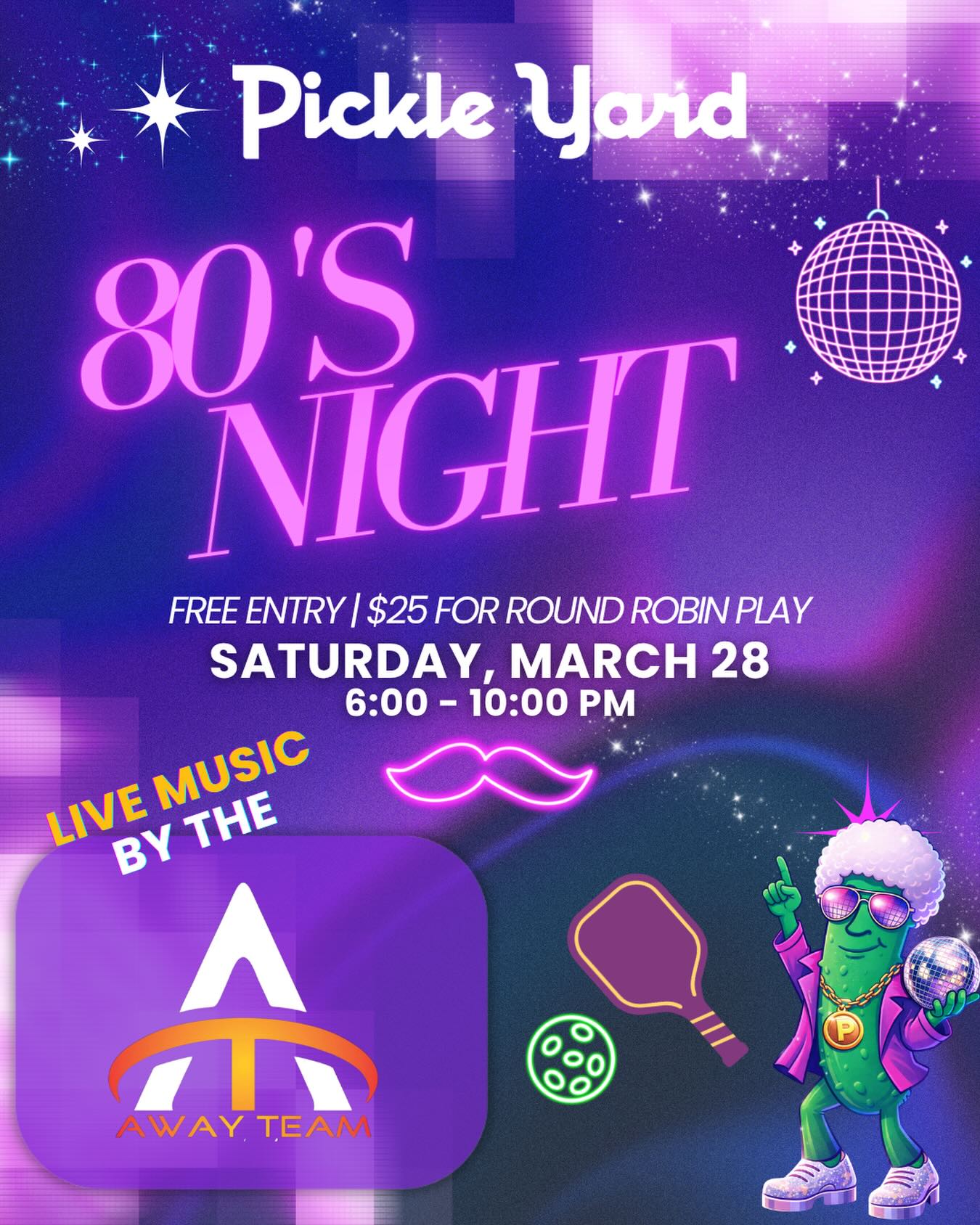 Join their 80’s night! Featuring all the 80’s feels, live music from Away Team, $25 for Round Robin Play, local food & drinks and more.