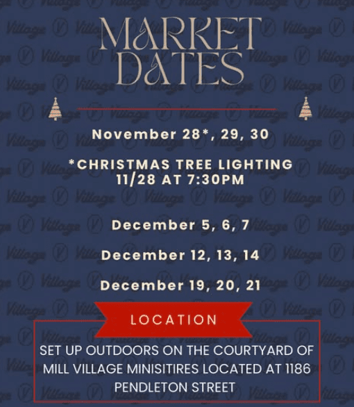 Shop from the kick off of the Holiday Market in The Village of West Greenville! Featuring local vendors, music, food & drinks, visits from Santa on select day/times and more every Friday-Saturday 12-7pm and Sunday 12-5pm through December 21st. Then stick around for a Christmas tree lighting in front of Kuka Juice & Oxford Barber Co. For more details click here.